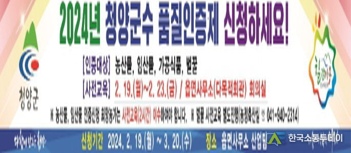 한국소통투데이 관리자 기자 | 청양군이 지역 특산품의 품질 향상과 소비자 신뢰 확보를 위해 올해에도 청양군수 품질 인증제를 추진한다고 7일 밝혔다.