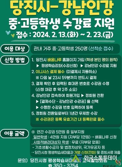 한국소통투데이 관리자 기자 | 당진시가 사교육비로 인한 부모들의 경제적 부담을 덜어주기 위해 강남구청 인터넷 수능방송 수강료를 지원한다.