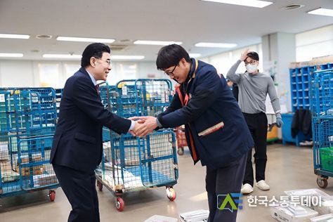 한국소통투데이 관리자 기자 | 이응우 계룡시장이 설 명절을 맞아 8일 금암동 우체국을 찾았다. 시에 따르면 이 시장의 우체국 방문은 설 명절로 우편, 택배 등 물동량 증가에도 맡은 바 소임을 다하는 집배원과 우체국 직원을 격려하기 위한 것으로 알려졌다. 이 시장은 “시민 편의를 위해 어려운 여건에도 항상 최선을 다하시는 우체국 직원들에게 감사드린다”고 말했다.