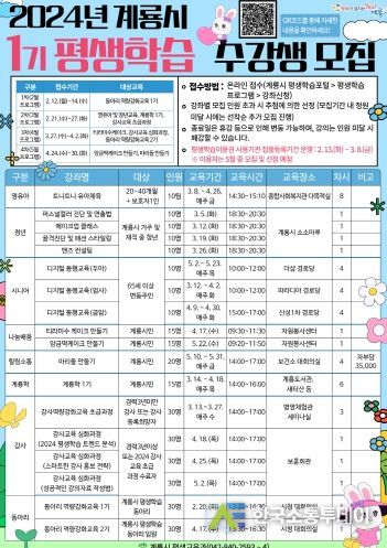 한국소통투데이 관리자 기자 | 계룡시가 시민들의 평생학습 욕구 충족 및 지역 평생교육 활성화를 위하여 ‘2024년 1기 평생학습 프로그램’을 오는 3월부터 5월까지 3개월간 운영한다고 밝혔다.