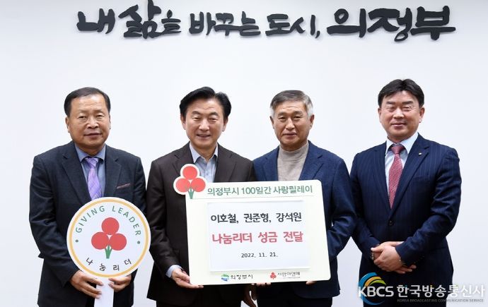 한국방송통신사 관리자 기자 | 의정부시는 11월 21일 송산3동 사회단체협의회장 및 방위협의회장 이호철(태진테크 대표), 송산3동 주민자치회 위원 권준형(미주건축 대표), 前송산3동 주민자치회 위원 강석원(진산건설 대표)이 의정부시 저소득층 지원을 위한 성금 이호철, 권준형 각 100만 원, 강석원 200만 원을 기부하며 의정부시 나눔리더 26호(이호철), 27호(권준형), 28호(강석원)로 가입하게 됐다고 밝혓다.