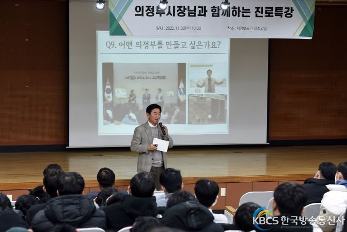 한국방송통신사 관리자 기자 | 김동근 의정부시장은 11월 30일 의정부공업고등학교에서 1학년 학생 150여 명을 대상으로 진로 특강을 실시했다. 특강은 의정부공업고등학교 졸업생인 김 시장이 시의 미래를 이끌어갈 청소년들을 격려하고 소통하기 위해 마련됐다. 의정부공업고등학교는 1943년 설립 이래 대한민국의 산업 역군들을 양성했고, 80여 년 동안 총 30,000여 명의 졸업생을 배출해 사회 각 분야에 진출시킨 역사와 전통을 자랑하는 명문 고등학교이다.