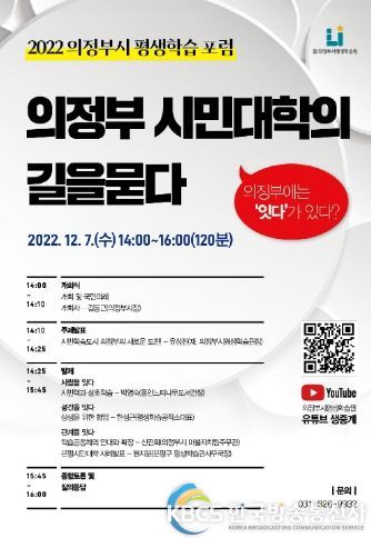 한국방송통신사 관리자 기자 | (재)의정부시평생학습원은 오는 12월 7일, 학습원 대강당에서‘의정부 시민대학의 길을 묻다’라는 주제로 의정부 시민대학의 방향성 및 발전방안을 모색하는 2022 의정부시 평생학습 포럼을 개최한다.