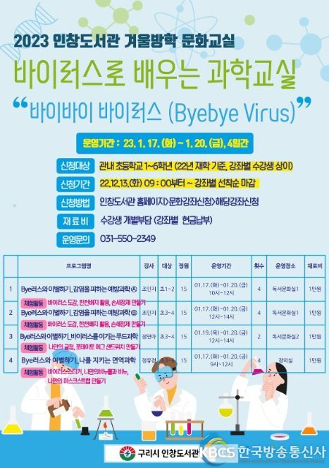 겨울방학 문화교실은 '바이러스로 배우는 과학교실 바이바이 바이러스 (Bye bye Virus)'라는 주제로 오는 2023년 1월 17일부터 20일까지 4일간 운영된다.