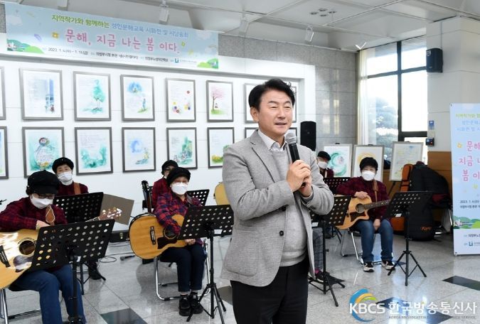 한국방송통신사 관리자 기자 | 김동근 의정부시장은 1월 4일 의정부시청 시민갤러리에서 개최된 성인문해교육 시화전 및 시낭송회에 참석했다. 이날 행사에는 의정부노성야간학교 초·중등반 어르신들의 작품 50여 점이 전시됐고 직접 지은 창작시 3편을 낭송했다.