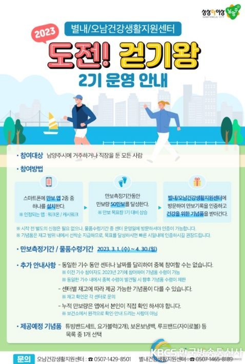 한국방송통신사 관리자 기자 | 남양주풍양보건소는 생활 속 움직임을 활성화해 걷기실천율을 높이고 시민의 건강증진을 도모하기 위해 3월 1일부터 4월 30일까지 만보 걷기 프로그램 ‘도전! 걷기왕’을 운영한다.
