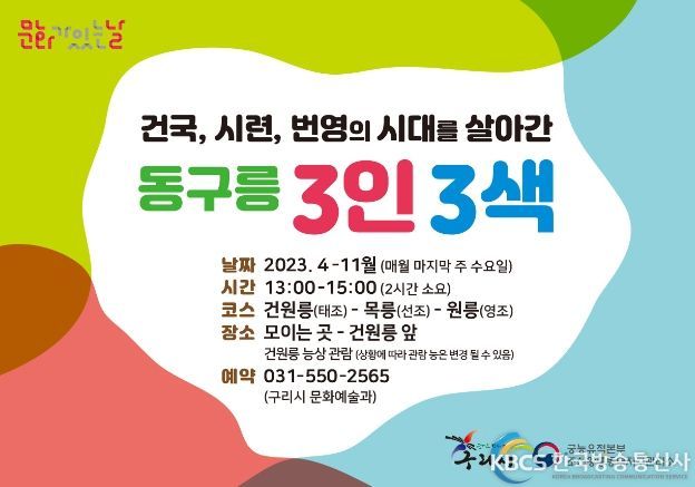 한국방송통신사 관리자 기자 | 구리시는 4월부터 11월까지 문화가 있는 날(매월 마지막 주 수요일)에 건국·시련·번영의 시대를 살아간 ‘동구릉 3인 3색’ 프로그램을 신규로 진행한다.