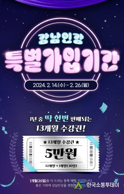 한국소통투데이 관리자 기자 | 꿈이 모이는 도시, 미래를 그리는 강남구 새 학기를 맞아 2월 14일부터 26일까지 강남인강 특별 가입 이벤트를 실시한다. 전 과목 수강권에 수강 기간을 1개월 더 추가해 총 13개월을 이용할 수 있는 혜택이다.