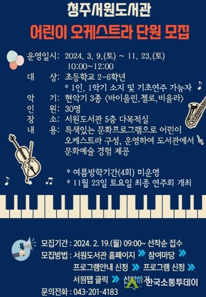 한국소통투데이 관리자 기자 | 청주서원도서관은 ‘어린이 오케스트라’ 단원을 모집한다고 15일 밝혔다.