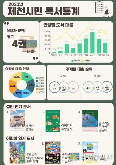 한국소통투데이 관리자 기자 | 제천시립도서관은 지난해 도서관을 방문한 시민들의 이용 현황 데이터를 분석하여 '2023년 제천시민 독서통계'를 발표했다.