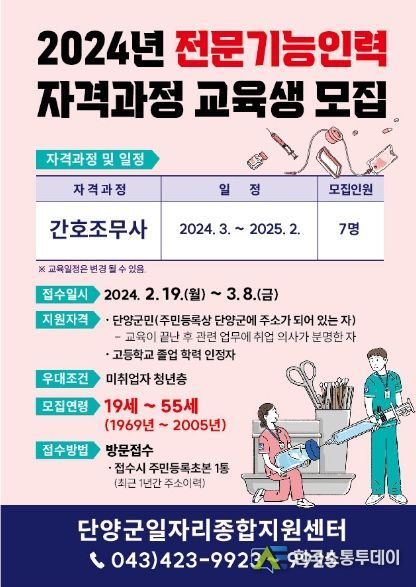 관련 업무에 취업 의사가 분명한 고등학교 졸업 이상의 19세∼55세의 단양군민이면 누구나 지원할 수 있다.