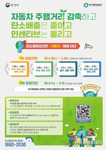 한국소통투데이 관리자 기자 | 청주시는 수송 부문의 온실가스 감축 활성화를 위해 2024년 자동차분야 탄소중립포인트제 참여자를 모집한다고 21일 밝혔다.