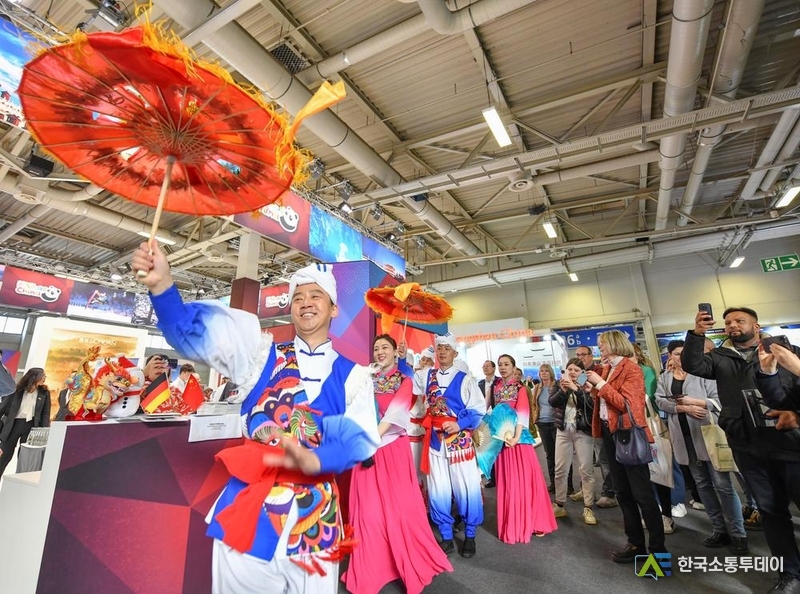 (베를린=신화통신) '2024 베를린 국제관광박람회(ITB 박람회)'가 5일(현지시간) 독일 베를린에서 개막했다. 본 박람회는 세계 최대 규모의 관광업 종합 전시회 중 하나로 올해는 3일간 진행된다.이날 '2024 베를린 ITB박람회' 중국 전시장에서 양거(秧歌·중국 북방 농촌 지역의 민간 가무)를 선보이는 산시(陝西)성 공연자들. 2024.3.6