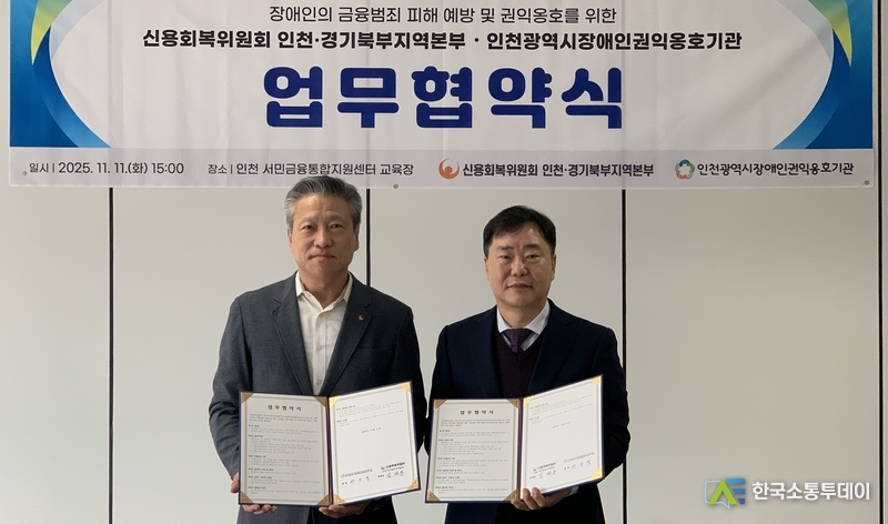 (한국소통투데이 통신사=김동현 기자) 인천시사회서비스원 소속 인천시장애인권익옹호기관은 신용회복위원회 인천·경기북부지역본부와 업무협약을 맺고, 장애인을 대상으로 한 금융범죄 피해 예방과 권익 옹호 활동을 강화한다고 12일 밝혔다.