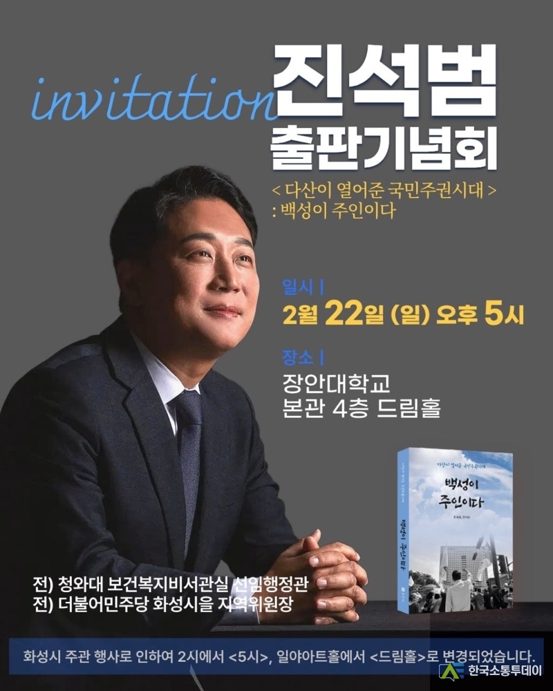 진석범 전 청와대 보건복지비서관실 선임행정관(전 더불어민주당 화성시을 지역위원장)이 오는 2월 22일 일요일 오후 5시, 장안대학교 본관 4층 드림홀에서 자신의 저서 『다산이 열어준 국민주권시대 : 백성이 주인이다』 출판기념회를 열고 본격적인 소통 행보에 나선다.