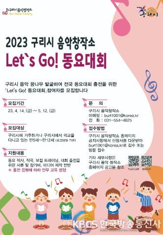 한국방송통신사 관리자 기자 | 구리시는 오는 5월 중 구리시 음악창작소에서 시작하는 ‘Let’s Go! 동요대회’의 참여 학생을 4월 14일부터 5월 12일까지 모집한다고 밝혔다.