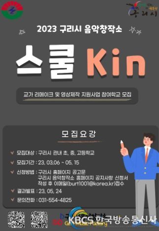 한국방송통신사 관리자 기자 | 구리시는 오는 5월 15일까지 구리시창작소에서 구리시 관내 초·중·고 학교를 대상으로 ‘2023 스쿨Kin(즐)’사업 참여 학교를 모집한다고 밝혔다.