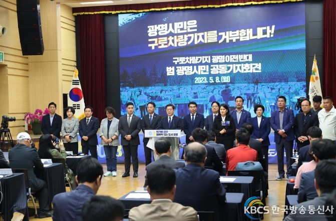 광명시는 8일 광명시청 대회의실에서 ‘구로차량기지 광명 이전 거부 범 광명시민 공동기자회견’을 갖고 끝까지 차량기지를 거부하겠다고 선언했다.