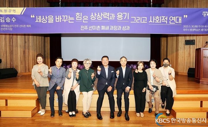 전주 성매매집결지 선미촌을 서노송예술촌으로 변모시키고, 성매매집결지를 해체한 김승수 前전주시장이 지난 5월 30(화) 파주시 평생학습관에서 파주시민, 공무원 등 150여 명이 참석한 가운데 ‘세상을 바꾸는 힘은 상상력과 용기, 그리고 사회적 연대’라는 주제로 강연을 했다.