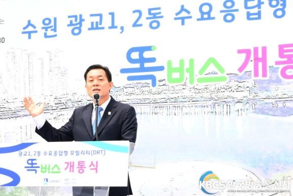 한국방송통신사 관리자 기자 | 이재준 수원특례시장은 1일 광교역사공원에서 열린 ‘똑버스 개통식’에서 “어르신들이 똑버스를 편리하게 이용할 수 있도록, 어르신들에게 앱 이용 방법을 잘 설명해 달라”고 당부했다.