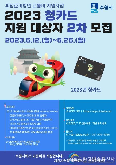 한국방송통신사 관리자 기자 | 수원시가 ‘2023년 취업준비청년 교통비 지원사업(청카드 사업)’ 지원 대상자 90여 명을 6월 26일까지 모집한다.