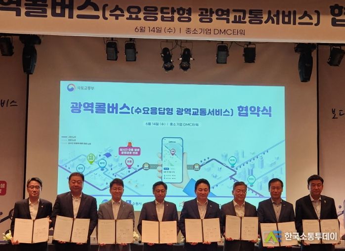수원시를 비롯해 공모사업 대상지로 선정된 6개 지자체와 국토교통부, 경기도는 14일 서울 상암 DMC타워 DMC홀에서 협약을 체결하고, 광역콜버스 시범사업에 적극적으로 협력하기로 했다.