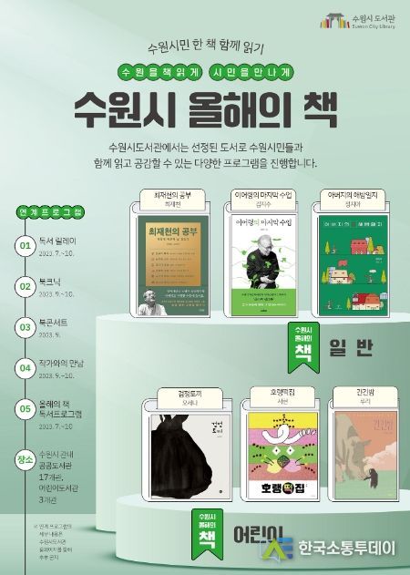 한국소통투데이 관리자 기자 | ‘수원시민 한 책 함께 읽기’로 ‘올해의 책’ 6권을 선정한 수원시도서관이 7월부터 11월까지 공연, 체험 등 다양한 연계 프로그램을 운영한다.