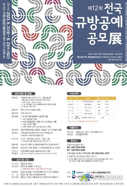 수원시가 주최하고, 수원시규방공예연구회가 주관, 문화체육관광부·농촌진흥청이 후원하는 이번 공모전은 전통 규방공예의 아름다움을 표현하고, 기술성·실용성 등을 갖춘 다양한 작품을 발굴하는 행사다.