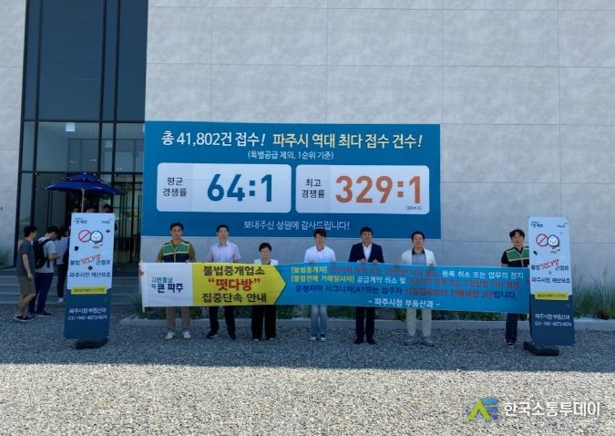 단속의 주요 대상은 운정 자이 시그니처 아파트의 계약 체결을 앞두고 불법 중개업을 하려는 속칭 ‘떴다방’ 등의 불법 투기 세력으로, 시는 현수막을 설치하는 등 불법거래행위 강력 근절을 위한 홍보활동을 전개했다.