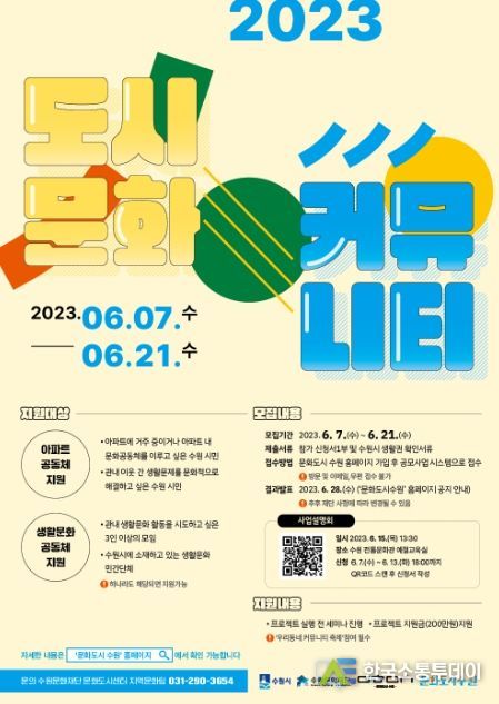 한국소통투데이 관리자 기자 | 수원문화재단문화도시센터에서 오는 21일 수요일까지 '도시문화 커뮤니티' 참여자를 모집한다.