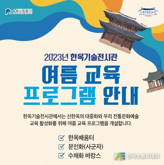 한국소통투데이 관리자 기자 | 수원문화재단은 오는 7월 5일부터 8월 26일까지 한옥기술전시관에서 ‘2023년 여름 교육 프로그램’을 운영한다.