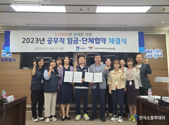 한국소통투데이 관리자 기자 | 수원시와 수원시공무직노동조합은 21일 시청 영상회의실에서 ‘2023년 공무직 임금·단체협약’을 체결했다.