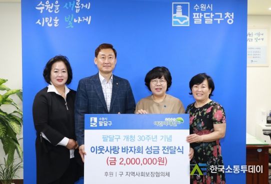 한국소통투데이 관리자 기자 | 팔달구는 지난 21일 구청장실에서 팔달구 지역사회보장협의체 주관 이웃사랑 바자회 수익금(금2,000,000원) 전달식을 가졌다.