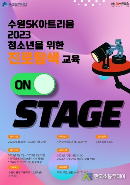 한국소통투데이 관리자 기자 | 수원문화재단은 7월 21일까지 ‘무대기술 아카데미 청소년을 위한 'ON-STAGE 진로탐색'’ 교육생을 모집한다.