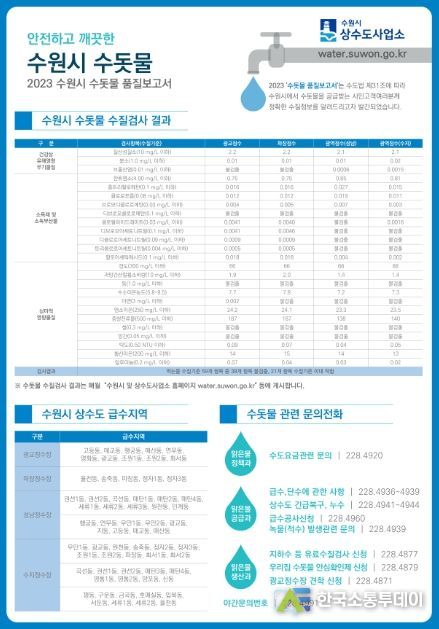 수원시상수도사업소가 수돗물 원·정수 수질 기준, 수질검사 결과, 수원시 상수도 시설 현황, 수돗물 생산·공급 과정, 맑은물 공급을 위한 노력, 안전한 수돗물 사용방법 등을 수록한 ‘2023 수원시 수돗물 품질보고서’를 제작해 시민들에게 공개했다.