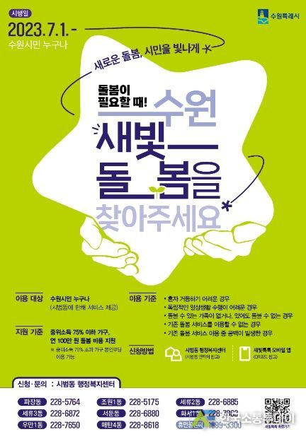 수원새빛돌봄 서비스는 동행정복지센터 돌봄창구에서 전화·방문 신청하거나 모바일 시민참여 플랫폼 ‘새빛톡톡’으로 신청할 수 있다.