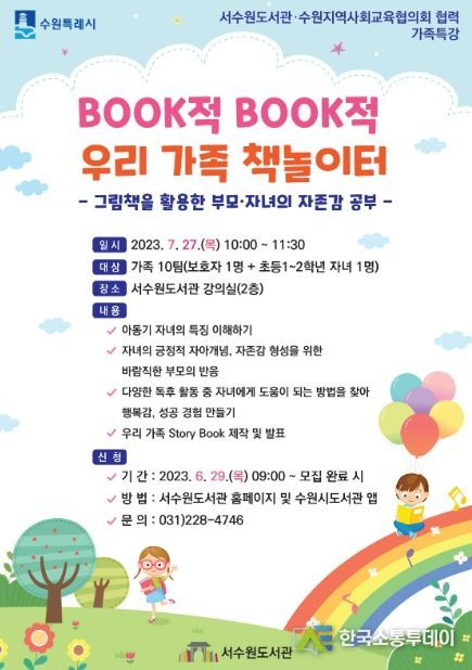 한국소통투데이 관리자 기자 | 수원시 서수원도서관이 ‘Book적 Book적 우리 가족 책 놀이터’ 특강에 참여할 가족을 6월 29일 오전 9시부터 모집한다.