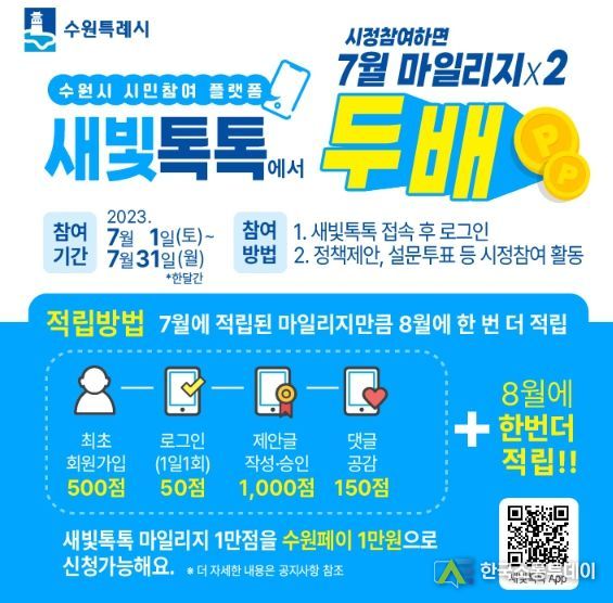 한국소통투데이 관리자 기자 | 수원시 시민참여 플랫폼인 ‘새빛톡톡’에서 활동하면 지역화폐로 전환할 수 있는 마일리지가 적립된다. 수원시는 새빛톡톡 정식 운영을 기념해 7월 한 달 동안 마일리지를 두 배로 주는 ‘마일리지 더블 적립이벤트’를 연다.
