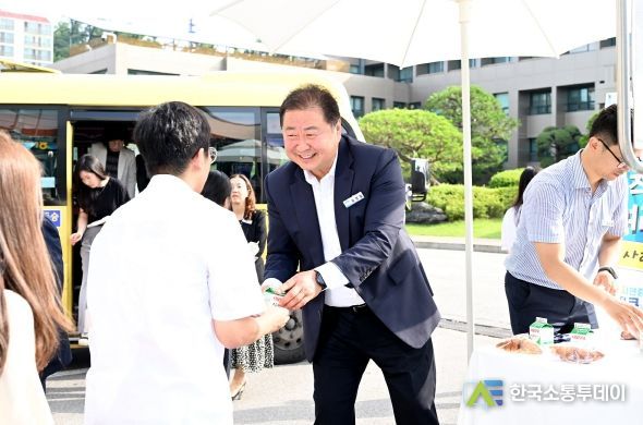 이날 출근길 지나가는 직원들에게 일일이 악수를 하며 빵과 우유를 나눠주면서, 지난 1년 동안 고생한 노력에 감사의 마음을 전했다.