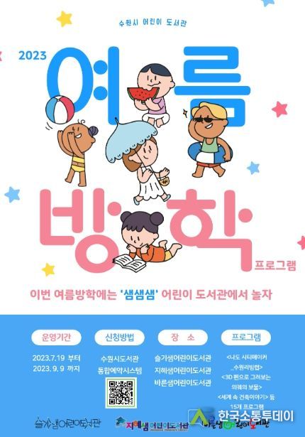 한국소통투데이 관리자 기자 | 수원문화재단은 오는 7월 19일부터 9월 9일까지 3개 어린이도서관에서 ‘2023년 여름방학 독서문화프로그램’을 운영한다.