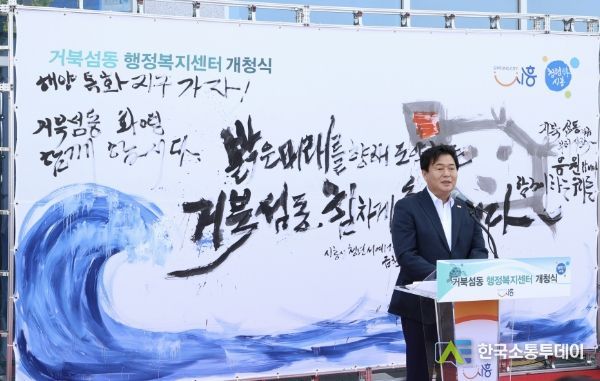 개청식 행사는 힘차게 도약하는 거북섬동의 밝은 미래를 바라는 ▲필묵 퍼포먼스를 시작으로 ▲주민들의 축하 메시지 ▲시설 조성 경과보고 ▲기념사 및 축사 ▲떡 케이크 커팅식 ▲기념 촬영 ▲청사 시설 관람 순으로 진행됐다.