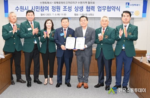 수원시와 국제로타리 3750지구 수원지역협의회는 6일 시청 상황실에서 업무협약을 체결하고 협력을 약속했다. 협약식에는 이재준 수원특례시장 국제로타리 3750지구 채규암 총재, 김석태 전 총재 등이 참석했다.