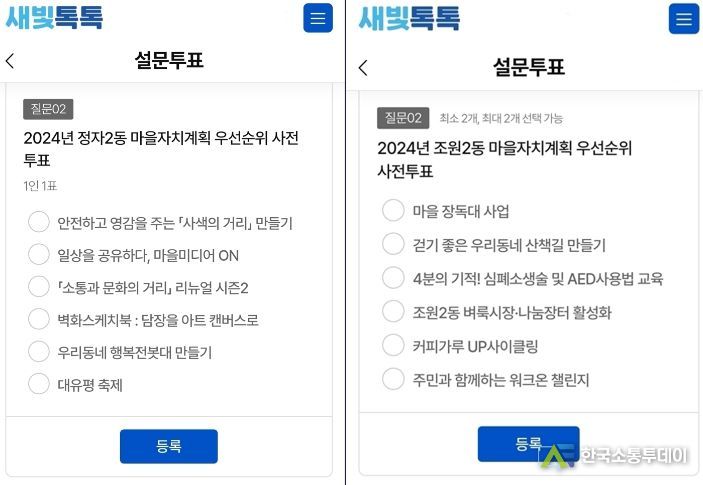 새빛톡톡 앱을 실행한 뒤 첫 화면에서 ‘설문투표’ 메뉴를 터치하면 현재 진행 중인 투표 주제들이 나온다. 그중 자신이 거주하는 동에서 진행하는 주제를 선택해 내년도 마을자치사업 목록과 사업내용을 확인하고, 가장 필요하다고 생각하는 사업에 투표하면 된다.