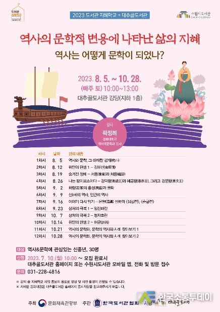 한국소통투데이 관리자 기자 | 수원시 대추골도서관이 2023년 도서관 지혜학교 ‘역사의 문학적 변용에 나타난 삶의 지혜’ 수강생을 10일 오전 10시부터 모집한다.