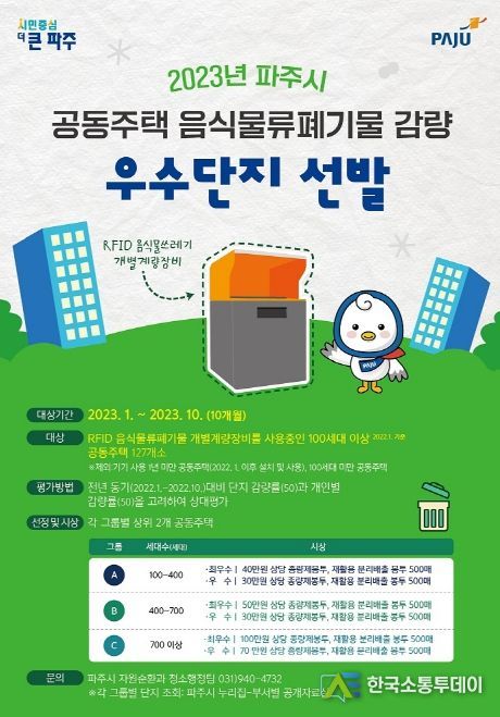 심재우 자원순환과장은 “2011년 이후 선제적인 알에프아이디(RFID) 음식물쓰레기 개별계량장비 도입 이후 파주시의 음식물쓰레기 감량효과가 크게 나타나고 있다”라며, “이번 음식물쓰레기 감량 우수단지 선발을 통해 시민들의 관심과 실천을 당부드린다”라고 말했다.