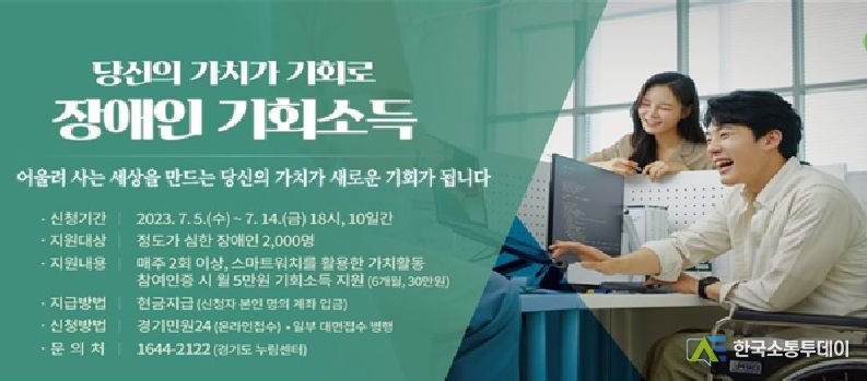 한국소통투데이 관리자 기자 | 파주시는 장애인의 활발한 사회참여를 유도하고, 건강 증진을 통한 사회적 가치를 창출하기 위한 ‘경기도 장애인 기회소득’ 사업신청자를 7월 14일까지 공개모집한다.