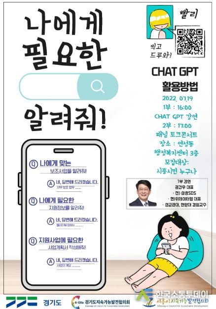 한국소통투데이 관리자 기자 | 시흥시지속가능발전협의회가 오는 19일 연성동 행정복지센터 3층 회의실에서 대화형 인공지능(AI)인 ‘챗(Chat) GPT 활용 특강’을 개최한다.