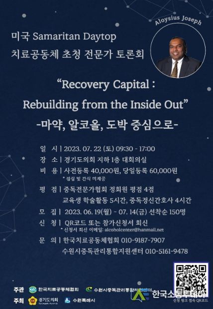 토론회는 세계적인 중독 치료공동체 기관인 미국 ‘사마리안 데이탑 빌리지’의 전문가 알로이시우스 조셉(Aloysius Joseph, AJ) 디렉터의 강연으로 진행된다.