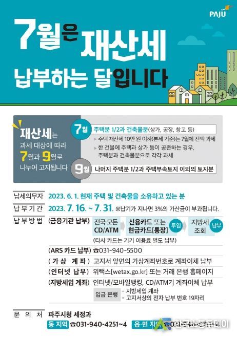 한국소통투데이 관리자 기자 | 파주시는 2023년 7월 정기분 재산세(주택·건축물) 404억 원을 부과했다.