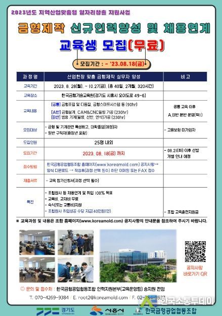 ‘산업현장 맞춤 금형제작 실무자 양성과정’은 금형 및 기계 관련 배경지식이 있거나 관심 있는 구직자를 대상으로 오는 8월 28일부터 10월 27일까지 한국금형기술교육원(시흥시 오이도로 49-6)에서 진행된다.